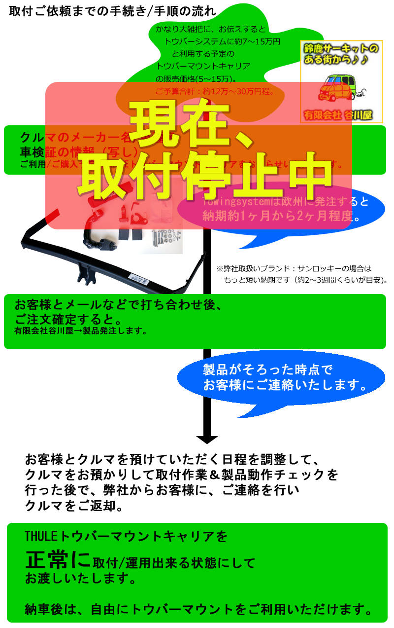 トウバー/ヒッチメンバーは別の店。トウバーマウントキャリアとの運用上の問題がある場合のどっちの店に行っても「相手のお店に聞いてください」という状況をなくして、有限会社谷川屋で、問題点がある度、ご相談いただく窓口がひとつで安心・安全・面倒(=時間のかかることもありますし、実際には、お客様はご面倒だと思いますが(^^;)などの負担が減少すると思います。