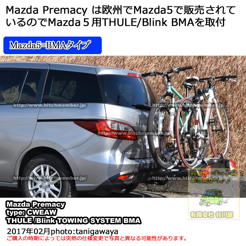 日本名:マツダプレマシーは欧州ではMazda5として販売されているので、これに適合するトウバーを手配して取付することで今回のような利用方法をつることが可能です。